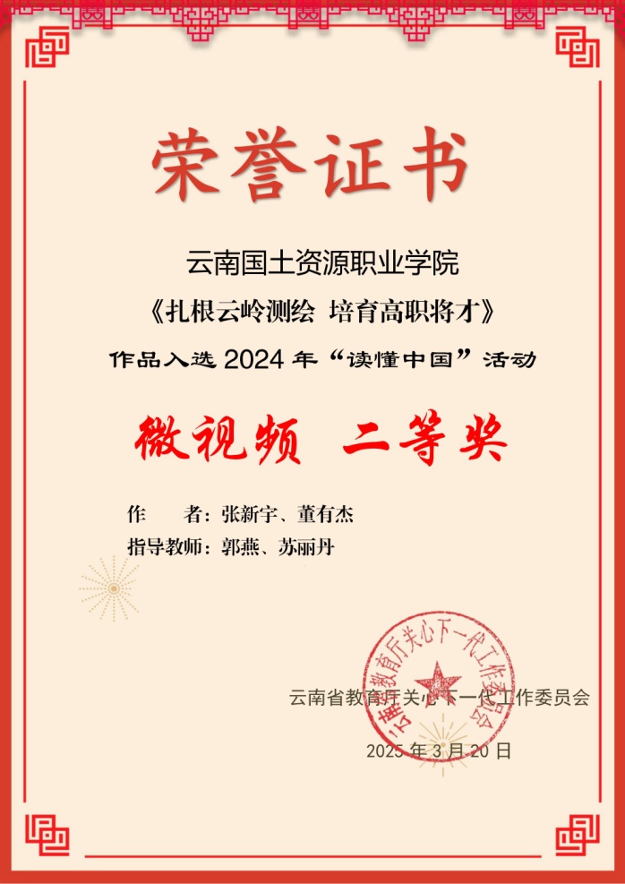 近日,云南省教育厅关工委公布2024年“读懂中国”活动评审结果中,我校斩获征文类二等奖1项、三等奖4项、微视频类二等奖1项,舞台剧类三等奖1项,共7个奖项。