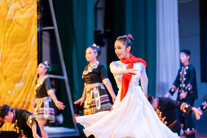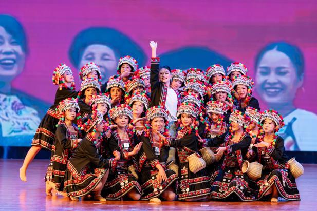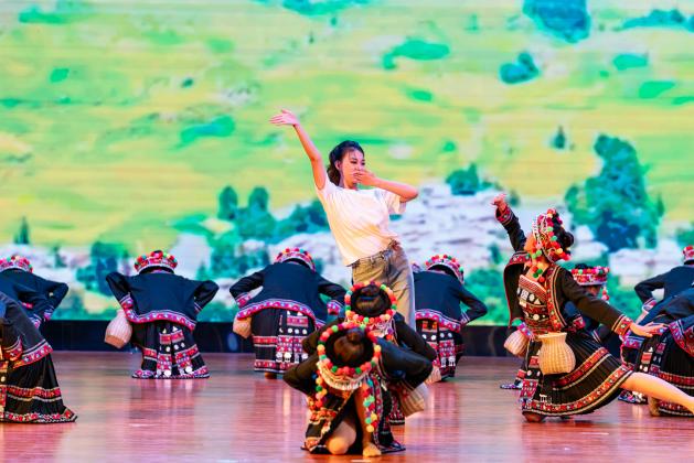 大学生艺术团的哈尼族原创舞蹈《向“春”而行》以我校与乡村振兴结对帮扶点绿春县戈奎乡之间的温暖情谊为背景,将绿春籍女大学生返乡支教的真实故事搬上舞台。哈尼姑娘的柔韧舞步与有力踏步交织,诠释教育帮扶从“输血”到“造血”的深刻转变,彰显新时代青年投身乡村振兴的担当。
