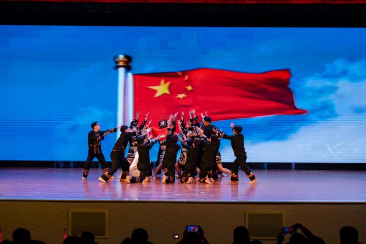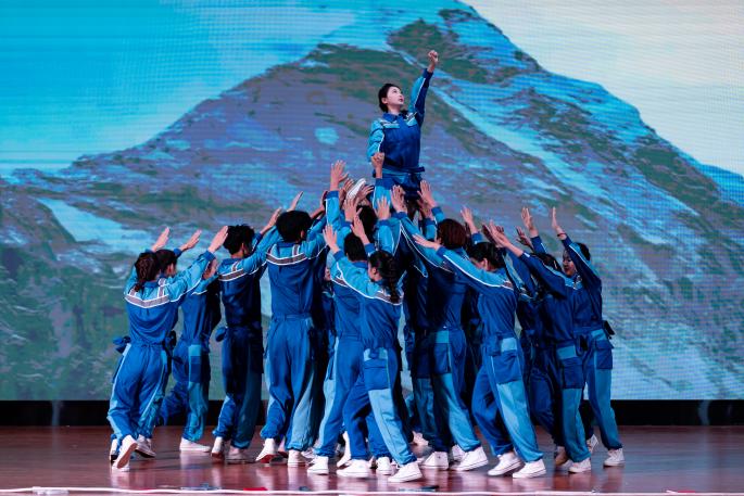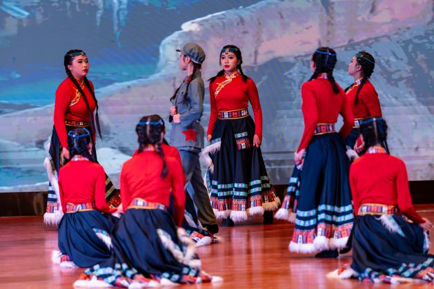 珠宝旅游学院舞蹈《唱支山歌给党听》,通过舞蹈重现西藏民主改革、百万农奴翻身解放的故事,将雪域高原的曙光化作长袖翻飞,舞步铿锵诉说对党的感恩之情,唱响民族团结进步强音。