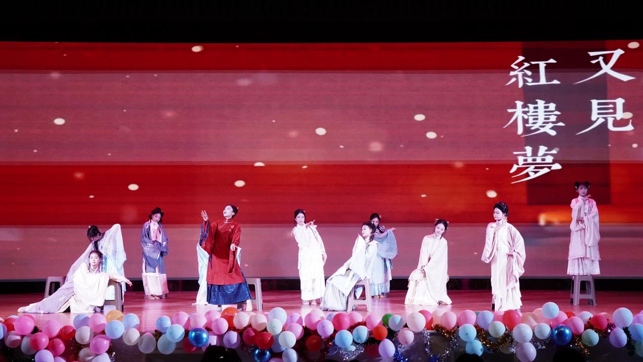 晚会在大学生艺术团乐队《一路向北》《月牙湾》的歌声中拉开序幕。整场演出分为三个篇章,层层递进,精彩纷呈。在第一篇章“青春之声,岁月赞歌”中,国标舞社的《Fadad》和Star街舞社的《Body》用动感舞步点燃全场;心理协会的《花田错》和食品安全协会的《舌尖上的“安全密码”》情景剧表演,巧妙结合社团特点,在艺术呈现中传递知识;大学生艺术团舞蹈队的《游园》则将传统文化与时代精神相融合,引发观众共鸣。