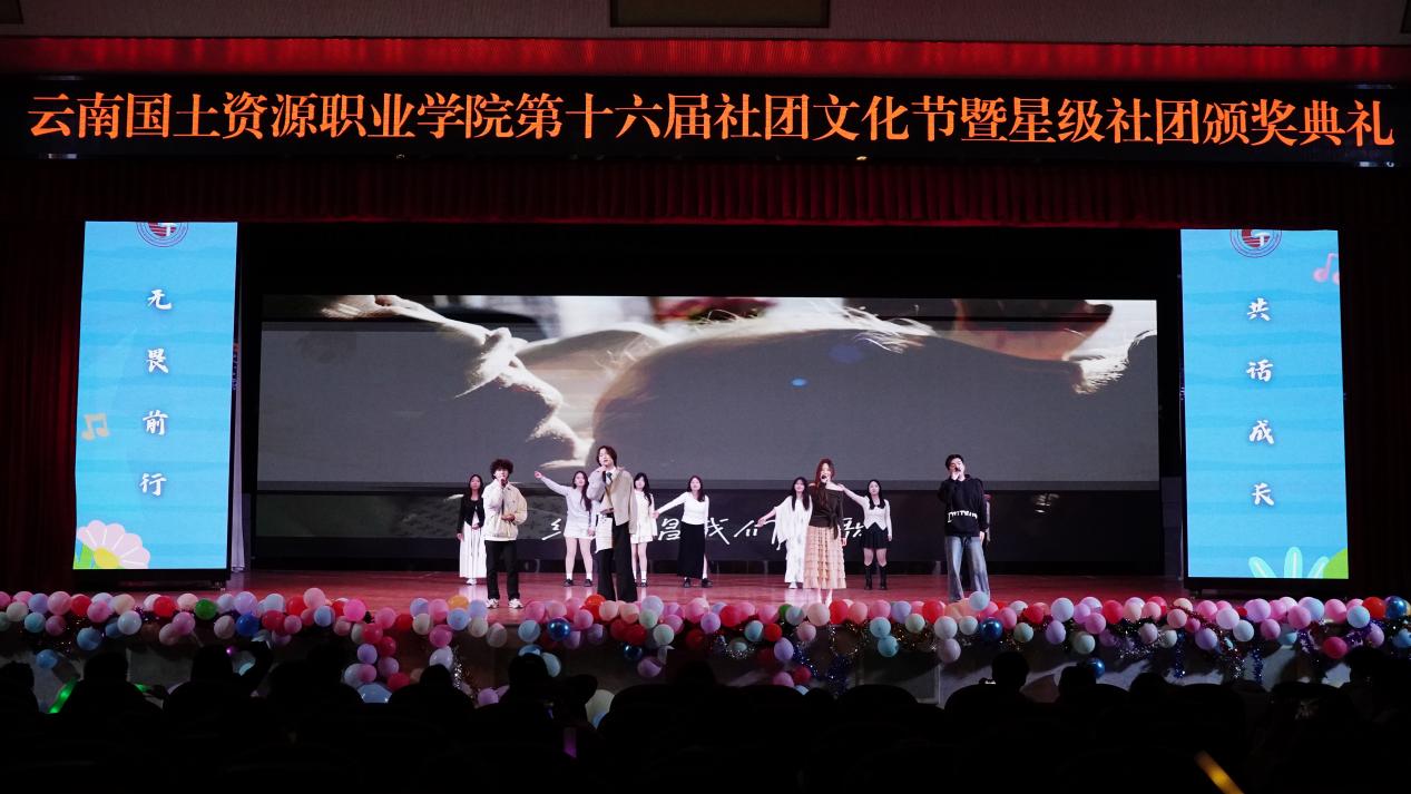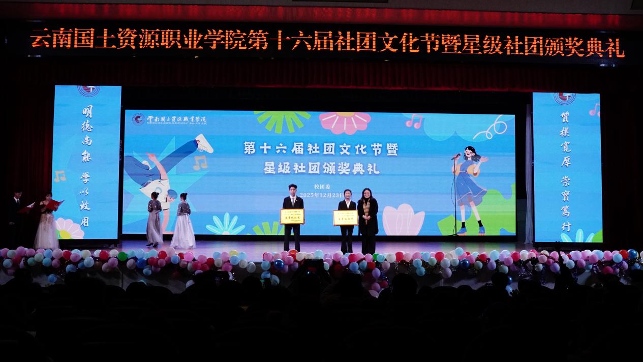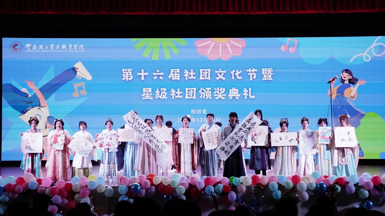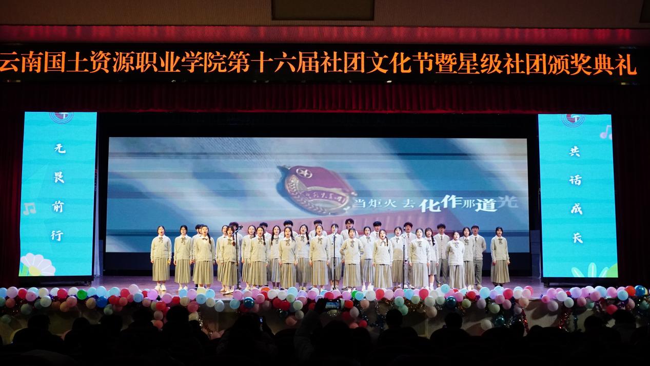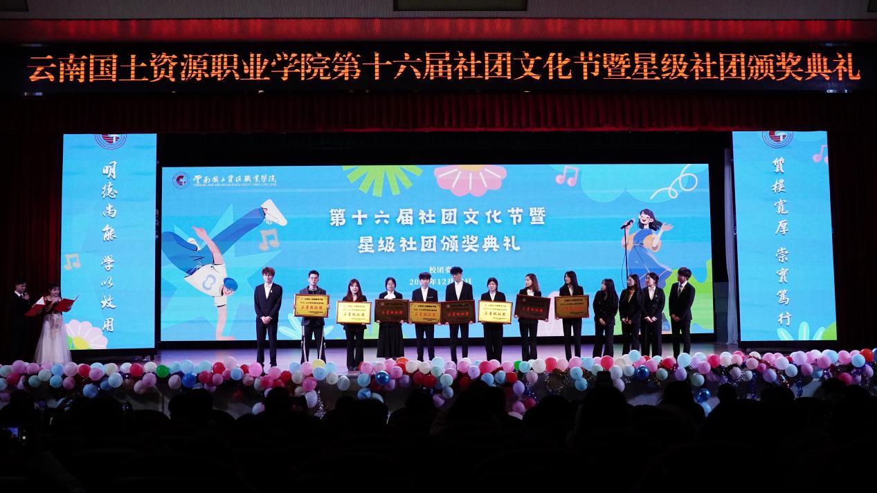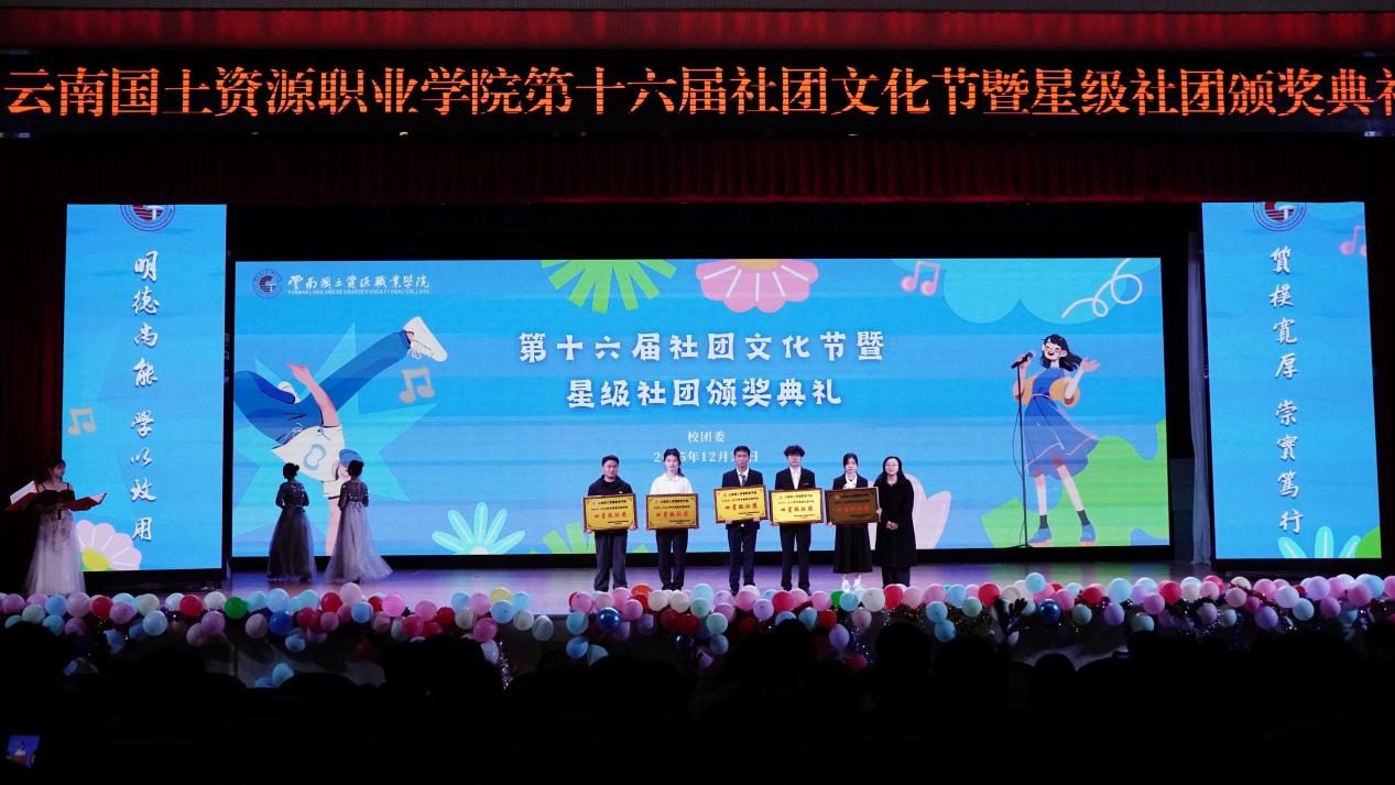 我校第十六届社团文化节暨星级社团颁奖典礼于12月23日晚在我校阳宗校区明礼堂圆满落幕。晚会通过形式多样的演出和展示,生动呈现了学生社团的蓬勃朝气与无限创意,展现出国土学子积极向上的青春风采。学校团委、社团管理部门老师与数百名同学一同参与了这场青春盛会。