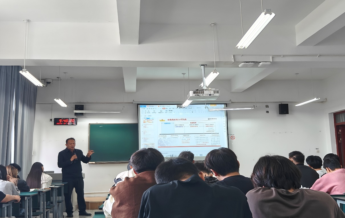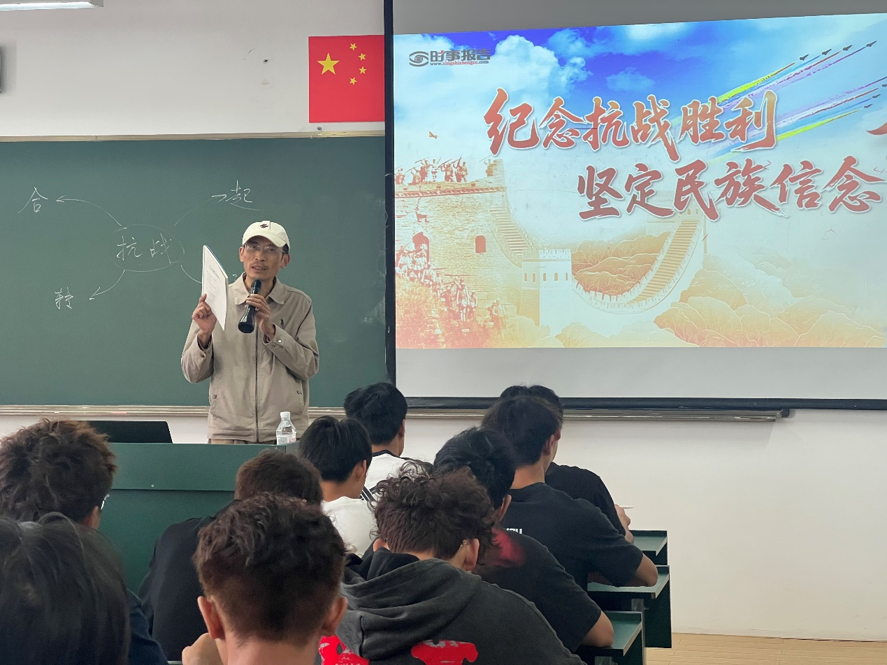 党委委员、副校长李光祥以“纪念抗战胜利 坚定民族信念”为题,从西南联大讲起,讲述云南抗战历史,教育学生要铭记历史,汲取奋勇前行的力量。引导学生爱己、爱家、爱国,涵养天下兴亡、匹夫有责的爱国情怀,做一个躬身入局的做事者。“美好的东西都需要我们对等的付出”,他用一句句金句、一个个贴近生活的例子讲解伟大抗战精神,激励学生坚定必胜信念。