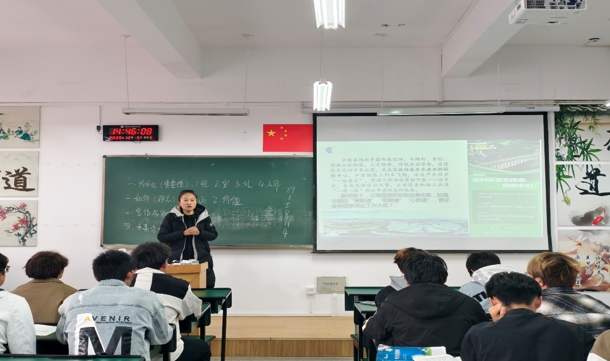 副校长张云霞以“携手周边国家,共创美好未来”为题,立足近期国际外交动态,深入剖析了我国周边地缘格局,阐释了中国外交的总体方向与重点战略,解读了我国的周边外交具体举措。并结合云南作为西南边疆省份、与多国接壤的独特地理优势,分析了云南在服务国家周边外交战略中的定位与潜力,为课堂教学提供了鲜活的本土案例和实践素材。