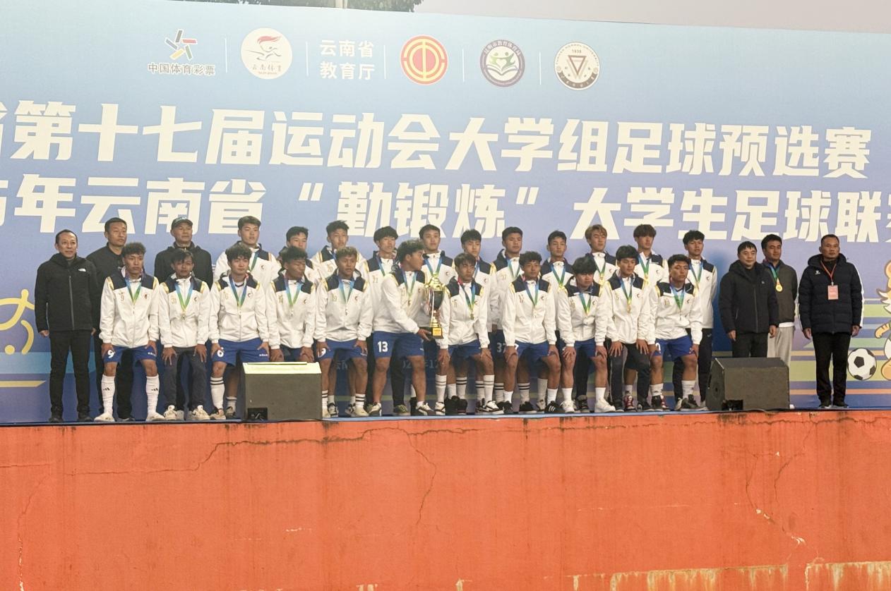 12月28日,云南省第十七届运动会大学组足球预选赛暨2025年云南省“勤锻炼”大学生足球比赛在昆明圆满落幕。经过激烈角逐,我校足球男子代表队登顶男子乙组冠军,女子代表队斩获女子乙组亚军。同时,女队凭借文明竞赛的良好风貌获评“道德风尚奖”,2名队员获“优秀运动员”称号,2名教师获评“优秀教练员”称号。