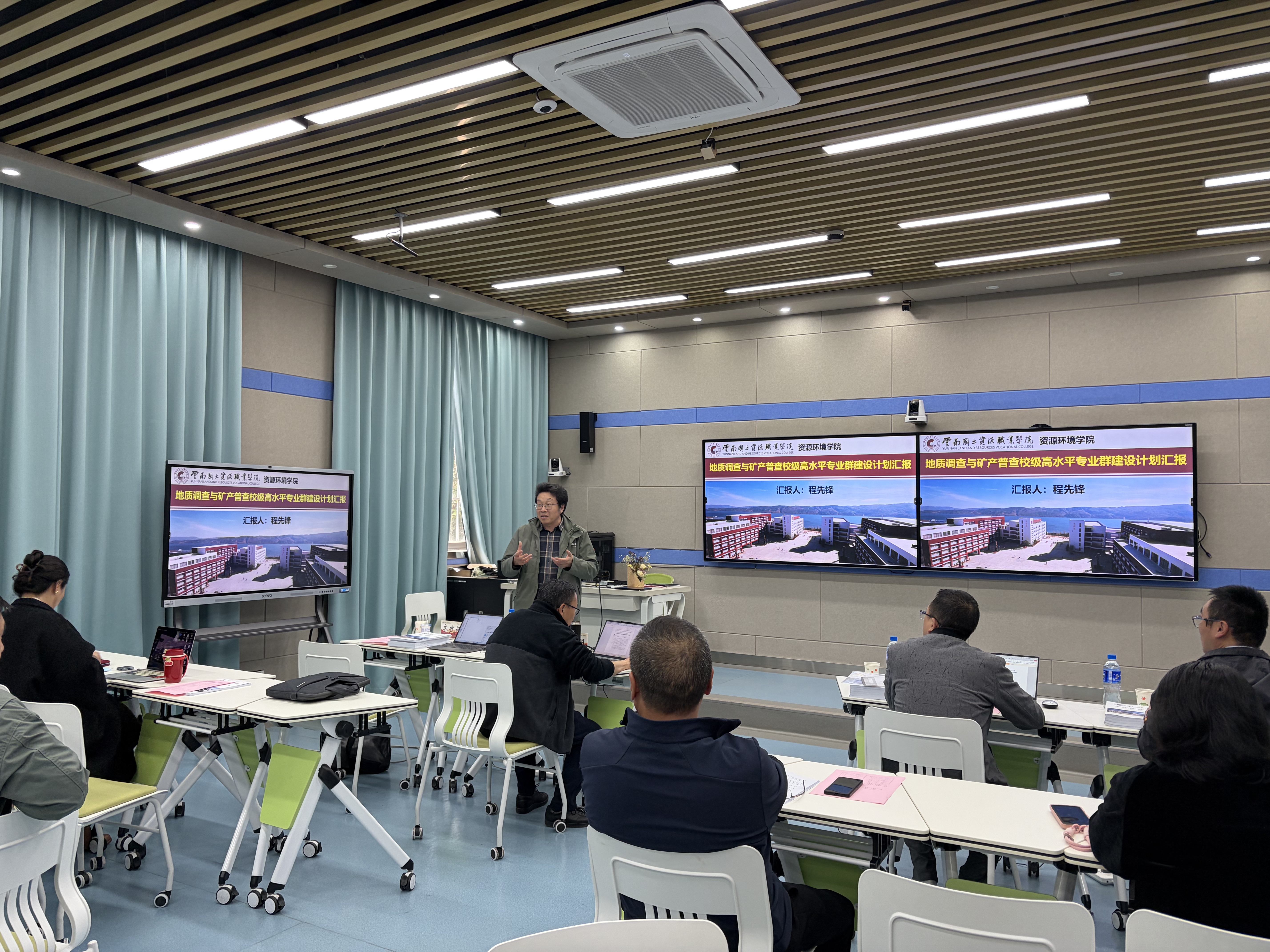 会上,齐武福副校长讲话,强调校级高水平专业群建设是学校优化学科布局、提升人才培养质量的重要举措,要求各负责人详实汇报建设规划,评审专家严格把关、精准建言,推动专业群建设工作走深走实。本次答辩由专家组组长黄晓明教授主持,地质调查与矿产普查等六个申报专业群的二级学院院长依次汇报,各院长紧扣建设基础与优势、需求与可行性分析、建设内容与举措、网络评审意见修改情况四大核心,系统阐述建设规划与实施路径,汇报重点突出、条理清晰。