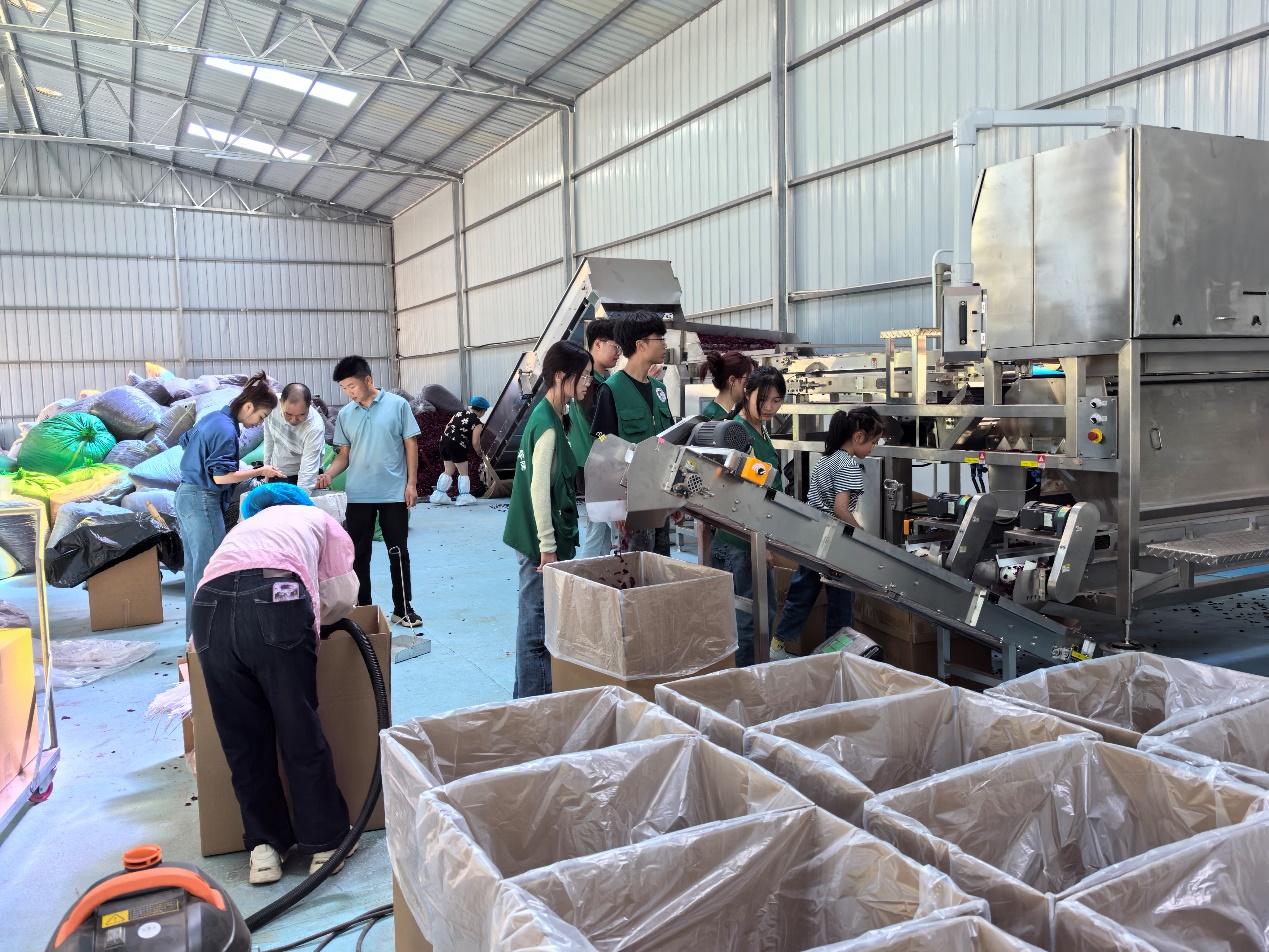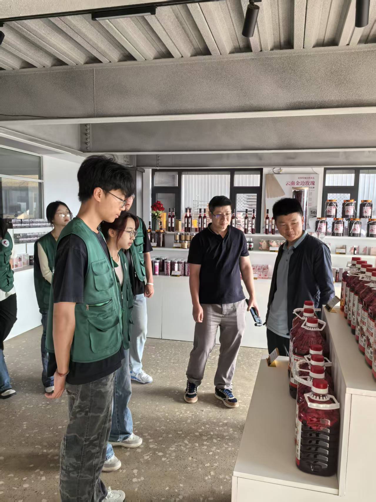调研组参观了小河边村3000多亩标准化玫瑰花种植基地,沈金祥副院长特别关注集中连片种植玫瑰花精细化种植与管理,并建议用遥感与无人机、AI、机械自动化技术等结合的方式提升玫瑰花种植的精准化管理水平,提升玫瑰花采摘的自动化水平。瞿华蓥老师则重点考察了产业用地布局,并建议依托“多规合一”的村庄规划,进一步优化加工区与设施农用地的用地配置与布局。此外,调研组还参观了玫瑰花冻干、分拣初加工车间,以及花茶、花醋、精油等20余种产品展销区域。对玫瑰花一产、二产、三产融合发展有了较为深入的了解和认识。值得一提的是,此次调研正逢“挑战杯”大学生创新创业大赛之际,国土空间信息学院的学生“创业小组”也借此机会深入了解了玫瑰花产业发展状况,对玫瑰花新产品开发、文旅服务均表现了极大的兴趣,将在调研后进一步优化参赛作品。