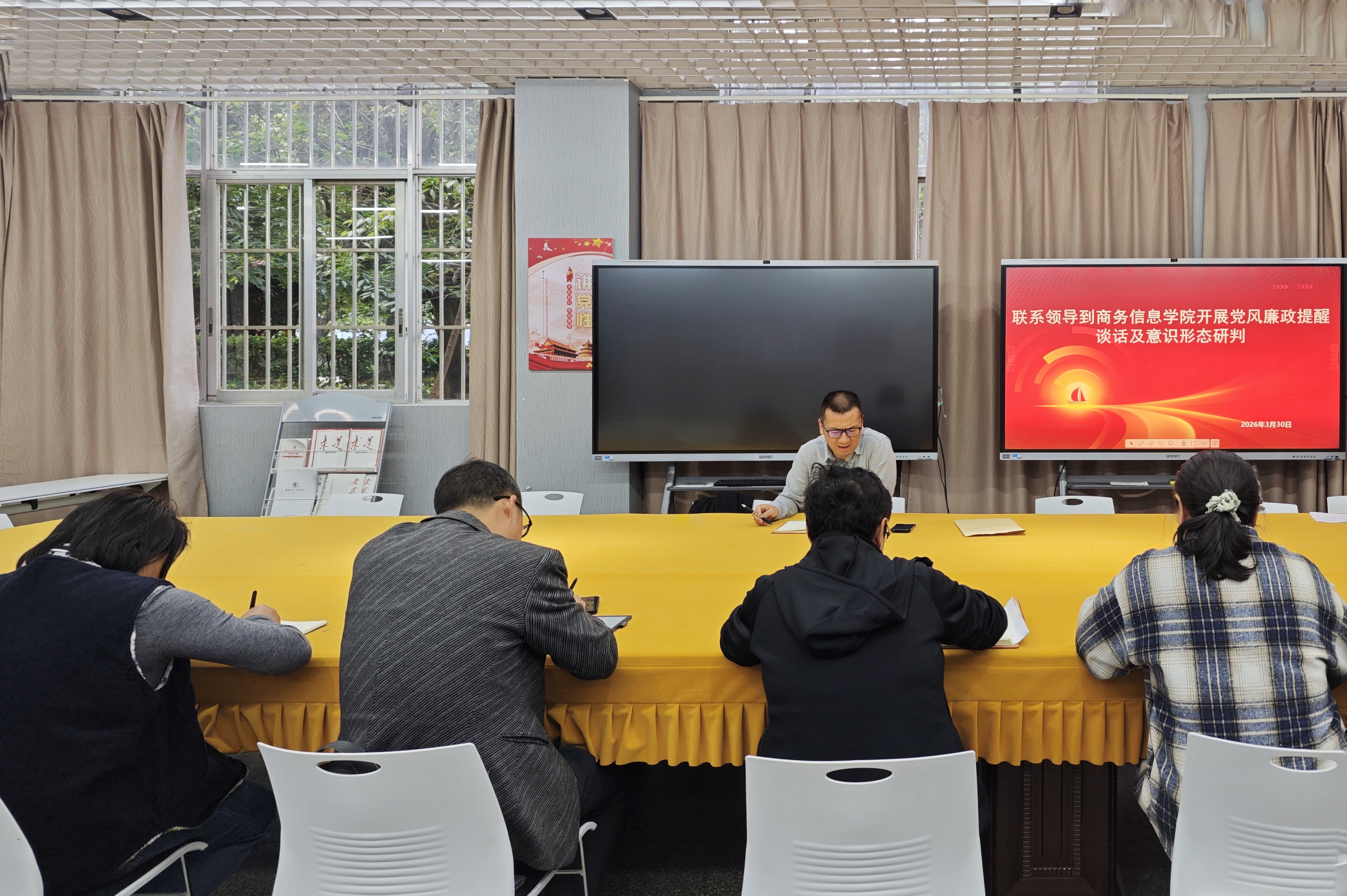 3月30日下午,寸建平副校长深入商务信息学院,就党风廉政建设及意识形态工作进行提醒谈话与风险研判,进一步推进学院党风廉政建设,强化意识形态工作责任制落实,学院党委委员、领导班子成员参与本次提醒谈话。