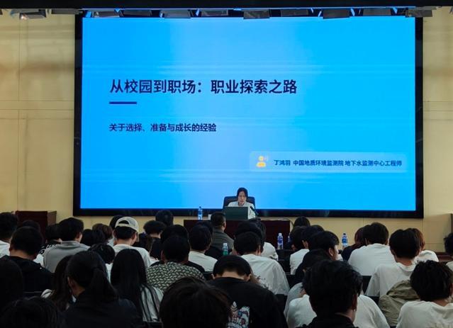 活动现场,周俊蓉以《云南高原的血脉——地下水》为题作科普讲座,系统介绍地下水基础知识、云南省地下水资源概况及保护要点。丁鸿羽以《从校园到职场》为题,围绕水工环专业发展、职业规划与就业准备作专题分享。互动交流环节,师生就地下水与日常生活、专业发展、地质灾害防治、升学就业选择等问题与专家深入交流。活动最后,全体师生参观地球日、地下水及地质灾害科普展板。