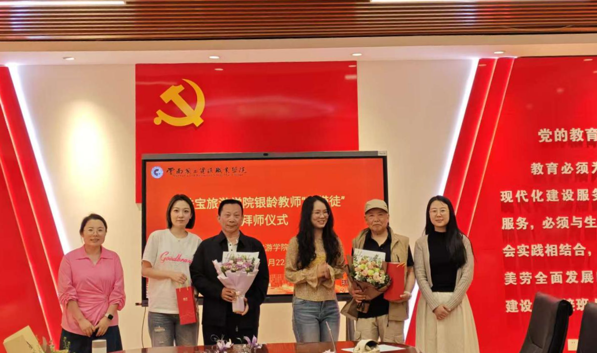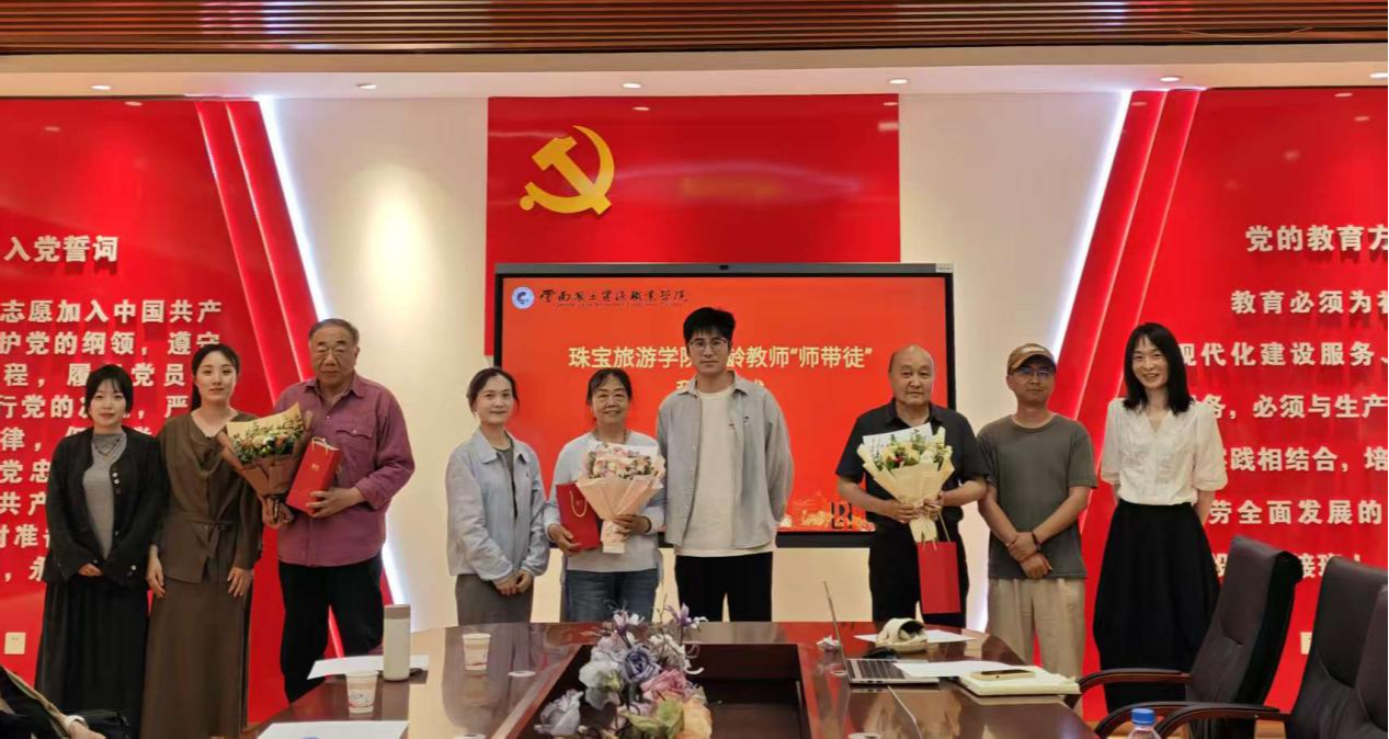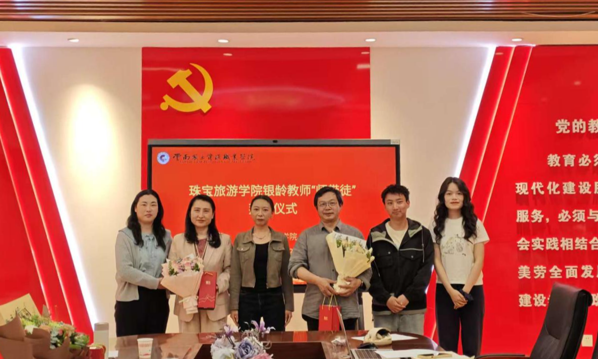 4月22日,珠宝旅游学院举行以“凝聚银龄智慧,赋能学院发展”为主题的银龄教师“师带徒”拜师仪式。学院领导班子、7位银龄教师、各教研室主任、专业带头人及14名青年教师参会,仪式由学院副院长陈雨帆主持。